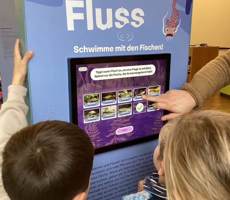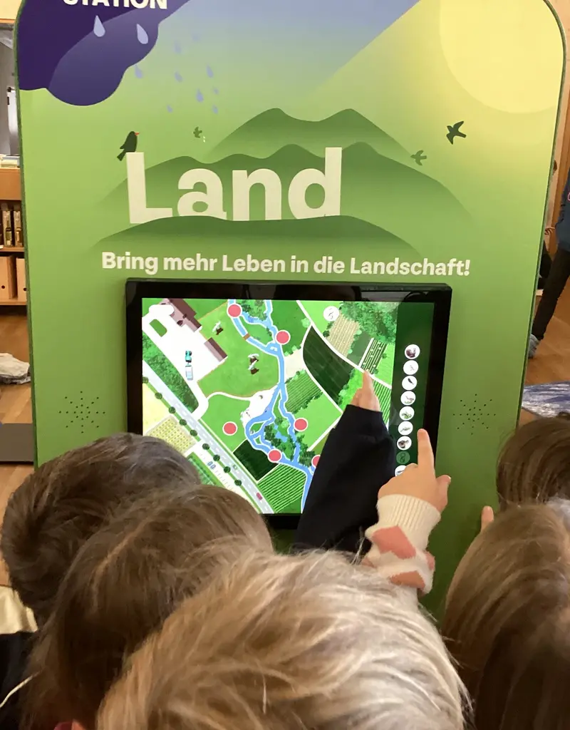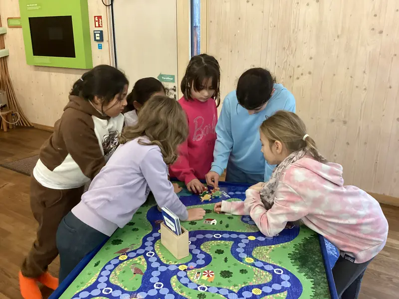 Empfangen wurden wir vom Förster Louis Kalikstein und seiner Kollegin Theresa. Während sich eine Gruppe gleich zu Fuß in den Wald begab, um dort bei fachkundigen Informationen und Naturerfahrungsspielen neue Kenntnisse und Sinneserfahrungen zu sammeln, blieb die andere Hälfte der Teilnehmer im Haus. Hier gab es auf einem großen Areal drei interaktive Stationen, bei denen die Kinder unter Anleitung des Försters spielerisch Aufgaben zu Hitze und Trockenheit, Starkregen und Hochwasser erarbeiten konnten. Die Spielaufträge wurden am Monitor präsentiert. Durch das selbständige Handeln am Bodenpuzzle, beim Gemeinschaftsspiel oder beim Städtebau stellten sich die Kinder spielerisch naturschutzrelevanten Fragen und Aufgaben und konnten dabei für ihre Gruppe Punkte sammeln. Die kleinen Preise, die Herr Kalikstein den Kindern in der Abschlussrunde überreichte, galten schließlich als Auszeichnung für große Wasserexperten. ug